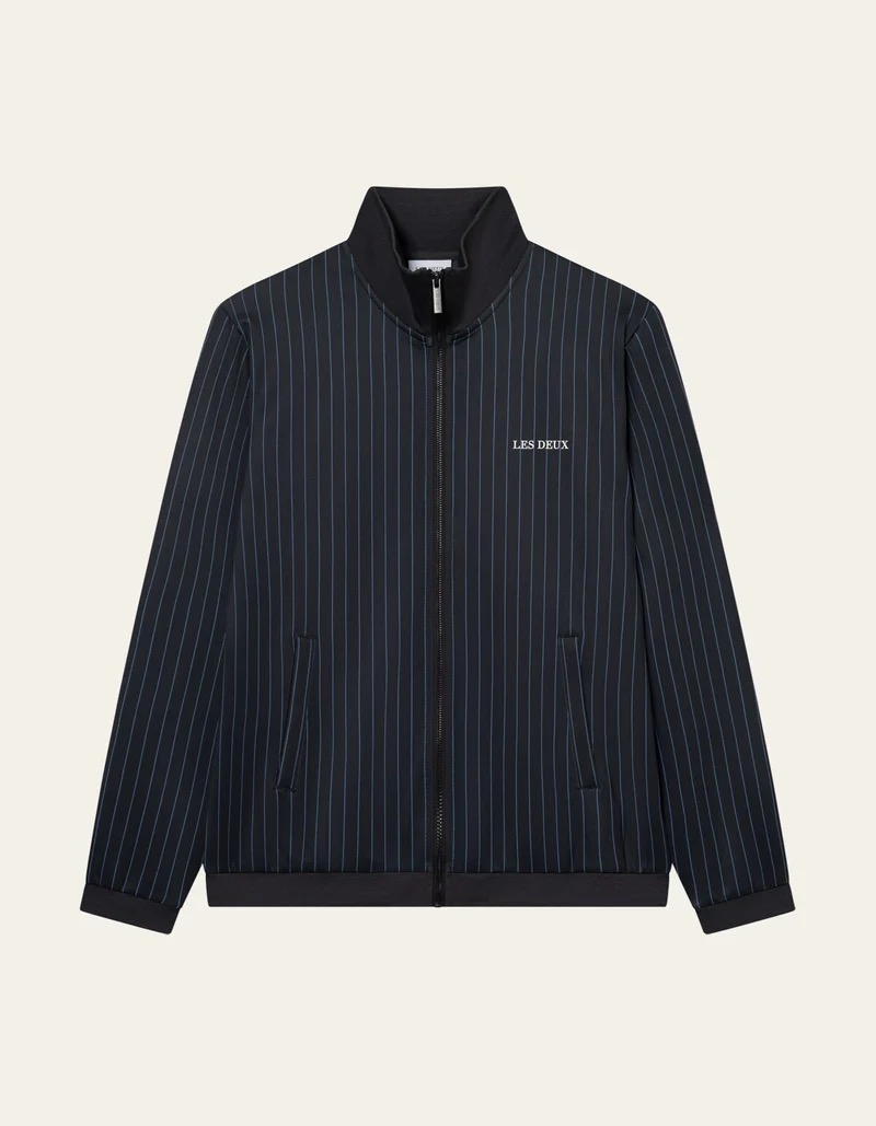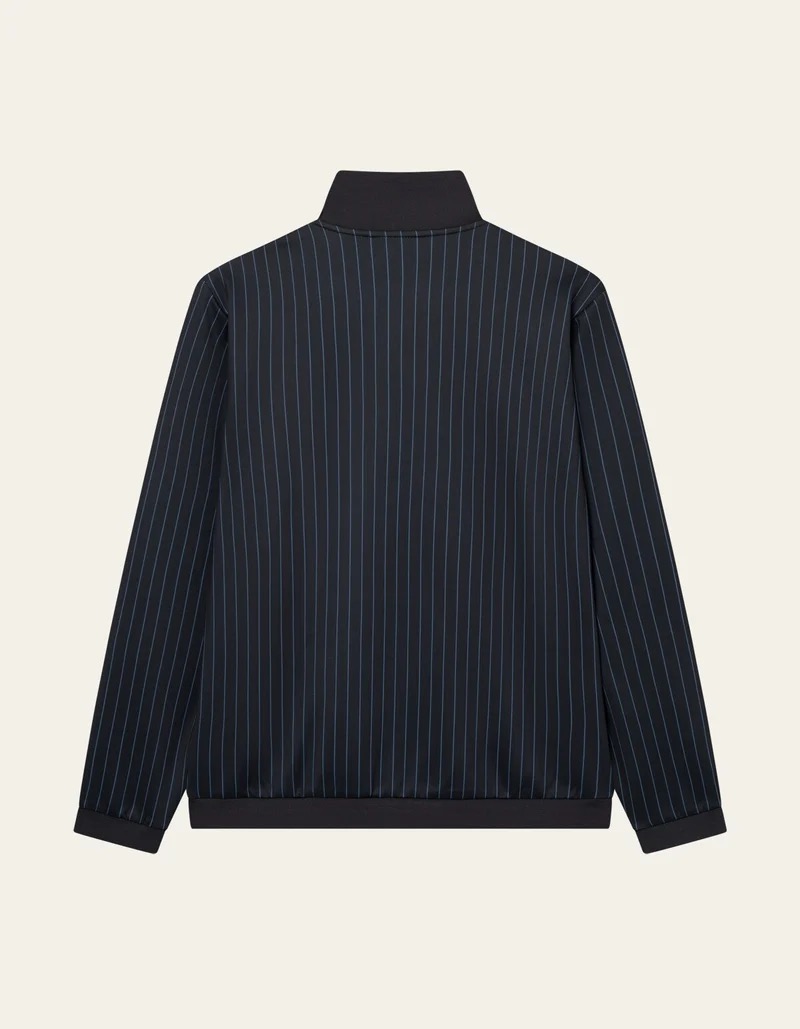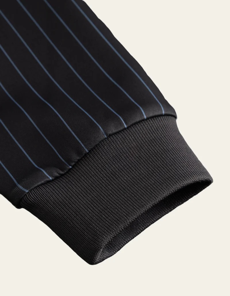 Une veste de survêtement technique revisitée avec une touche de coupe sur mesure. Le Ballier est confectionné dans un mélange extensible de polyester recyclé, orné d’un motif à fines rayures sur toute la surface, avec une fermeture éclair sur le devant et un logo sur la poitrine.